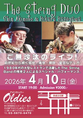 かるて1980年代に行列gできて1時間待ちと言う大型レストランで週一でレギュラー演奏したことがあります。その時のトリオの残党、マンドリンの秋元慎さんと僕のカビの生えたデュオ・チームで、3年ぶりにライブさせていただきます。場所も、残された昭和と言われる京成立石駅前商店街にあるアメリカンバー「オールディズ」でのです。
